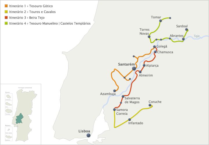 O rio Tejo e as lezírias são uma presença constante nos percursos da Rota do Vinho do Ribatejo. As terras são preenchidas com o cultivo de legumes, fruta e vinha e pela criação de touros e cavalos. As feiras e festas relacionadas com a agricultura vinha e coudelaria demonstram que a cultura ribatejana está intimamente ligada às actividades “da terra”.A cidade gótica de Santarém e o fantástico Convento de Cristo na cidade de Tomar são alguns dos monumentos mais belos da região. A serra também condiciona a paisagem da região: as Serras de Aire e Candeeiros impõem uma paisagem dominada pela pedra e que convida a caminhadas. Na zona ribeirinha passeie num barco varino pelo Tejo, aproveitando para observar a reserva natural do estuário do Tejo. |
